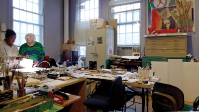 Artist Marcos Dimas (right) working with legacy specialist Alexandra Unthank as part of the Joan Mitchell Foundation’s CALL program in 2018.